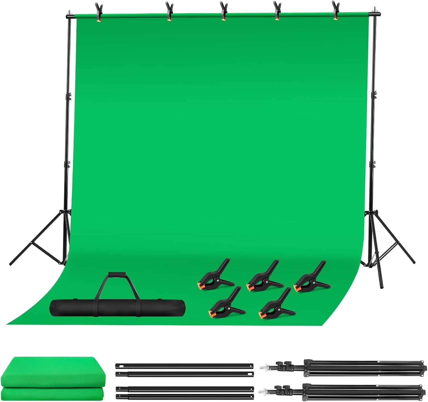 - đŚăComplete Kit, Ready to Useă: This green screen backdrop with stand kit includes: (2x) 6.5ft Support Stand, (4x) 2.62ft crossbars, (1x) 10×6.5ft green screen, (5x) spring clamps, and a storage bag. The fully collapsible tripod saves space and fits neatly into the included organizer bag for compact storage.