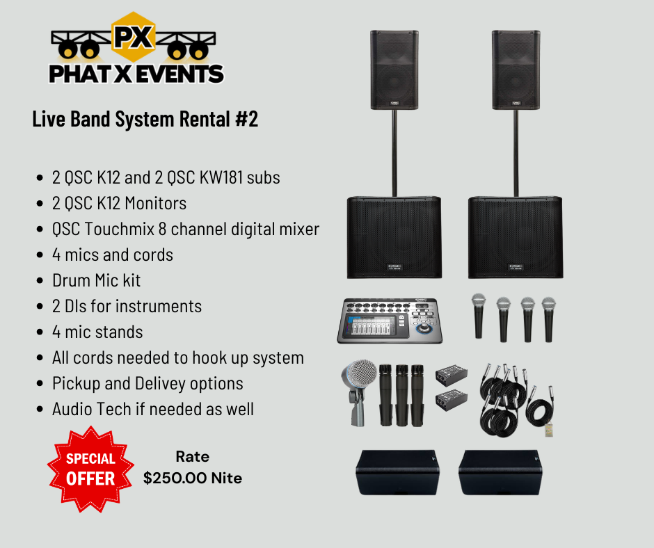 Live Band System Rental #2 includes The following: 2 QSC K12 and 2 QSC KW181 subs, 2 QSC K12 Monitors, QSC Touchmix 8 channel digital mixer, 4 mics and cords, Drum Mic kit, 2 DIs for instruments, 4 mic stands, All cords needed to hook up system, Pickup and Delivery options and Audio Tech if needed as well.